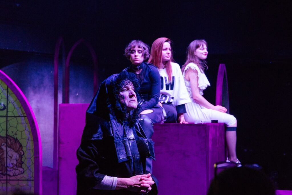 Autorstvo inscenace přistoupilo ve svém ztvárnění k rozdělení Jany z Arku do tří postav: Jana Panna, Jana Válečnice a Jana Mučednice. Každou z nich ztvárňuje jiná herečka – Magdalena Kuntová, Ema Lovecká a Šimona Horynová. Všechny jsou stále na jevišti a kromě toho, že postupně jedna střídá druhou, jak se odvíjí její příběh, suplují v jeho průběhu Janiny vnitřní hlasy, ty nebožské, její nejistoty, spory samy se sebou, dodávání si odvahy. Každá ze tří Jan je zároveň geneticky spojena s jednou současnou popovou ikonou: Panna s Lanou del Rey, Válečnice s Charli XCX a Mučednice s Billie Eilish. Nebudu se snažit předstírat, že mám ty zpěvačky naposlouchané, ale je zjevné, že jejich fankluby dostanou řádově bohatší zážitek. Důležité je, že spojení středověké dívky bojující nejen s anglickými žoldáky, ale také s předsudky vlastního národa, s patriarchátem, a především konzervativním klérem, se současnými popovými divami, které také svým způsobem překročily či překračují zažité kulturní mantinely, přetavuje tradiční „nudnou“ legendu do provokativní roviny symbolu 21. století. Obzvlášť inspirativní je příběh Billie Eilish, která svou slávu vybudovala podobně jako Jana zezdola, na nahrávce vytvořené svépomocí a mimo velká nahrávací studia, jen s pomocí Soundcloudu a Instagramu.