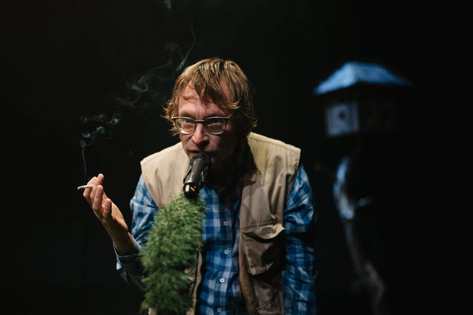 (Úvodní fotka pochází z performativní přednášky krtek kámen kyanid, která měla premiéru 17. 10. 2025 v Divadle DISK. Vojtěch Bárta v ní ztvárnil Zahrádkáře. FOTO: PETER PODOLSKÝ)