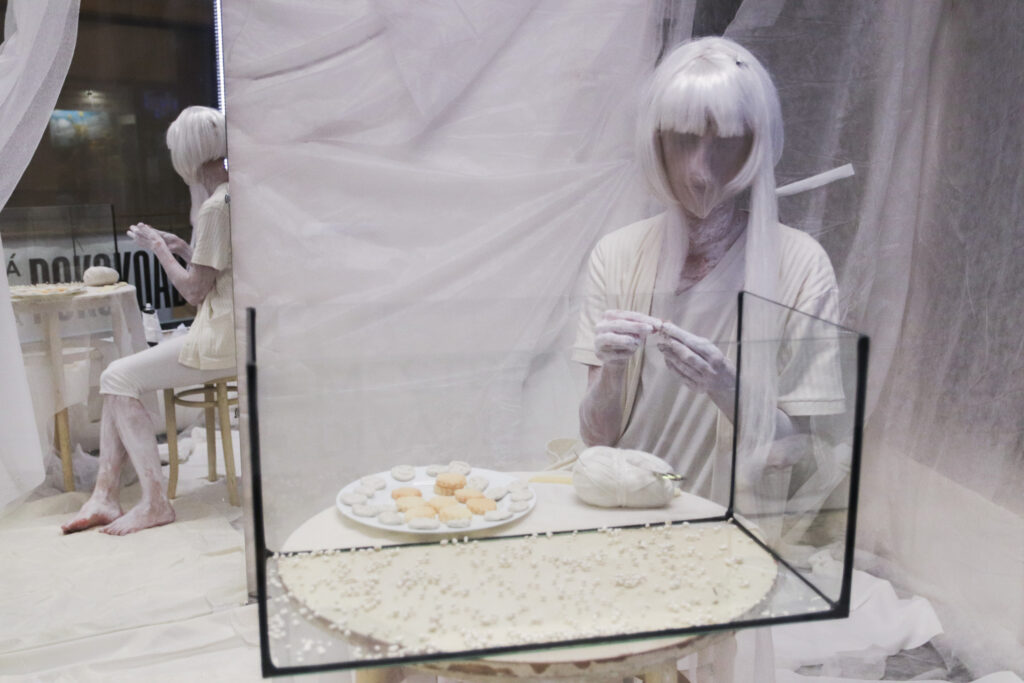 Ačkoliv se spíš než jako fotografka cítím jako žena s foťákem (což je subjektivní pocit a bylo by asi nudné, kdybych se ho snažila vysvětlovat), vybrala jsem snímek z Kafkovských performancí, které se konaly pod hlavičkou festivalu …příští vlna/next wave… V období covidových restrikcí v květnu 2021 probíhaly během čtyř dní několikahodinové performance ka3ka3, Jany Orlové, Martina Talagy a Krushy v uzavřené pokladně divadla Komedie. Já jsem měla tehdy jedinečnou příležitost a spoustu času dokumentovat umělce, diváky, kolemjdoucí i prostor. „Hrát si“ s nastavením fotoaparátu. Můj výběr nakonec padl na fotografii z performance Bída starého mládence od ka3ka3. Konkrétně na fotografii, kde jsem zachytila asi největší počet skleněných ploch a některé i opakovaně…