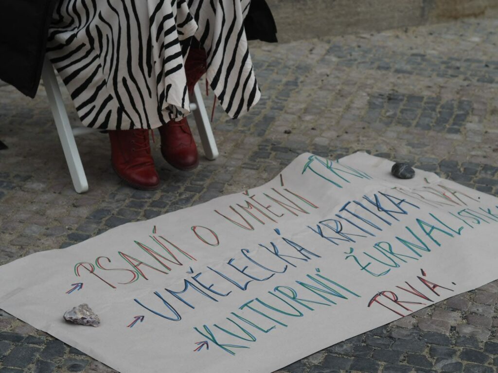 Píšu u mi­nis­ter­stva kul­tu­ry. Co tu dě­lám? Ak­ce vznik­lá ze spon­tán­ní­ho ná­pa­du. Ama­tér­ská per­for­man­ce o pro­fe­si­o­nál­ním psa­ní. O pro­fe­si. Psa­ní je fy­zic­ká pra­xe. Se­dím na žid­li, kte­rou jsem si sa­ma při­vez­la tram­va­jí. Se­dím na pro­test a se­dím z ne­po­sluš­nos­ti. Jin­de než do­ma, jin­de než vskry­tu, jin­de než o sa­mo­tě. Píšu ve­řej­ně. Ko­lem cho­dí li­dé, čtou si ná­pis. „Psa­ní o umě­ní tr­vá. Umě­lec­ká kri­ti­ka tr­vá. Kul­tur­ní žur­na­lis­ti­ka tr­vá.“ Ne­za­sta­ví se. Jdou, pro­jdou, je to je­jich ná­zor.